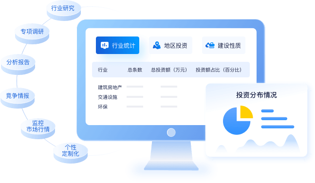 貼近市場(chǎng)實(shí)情的建設(shè)投資統(tǒng)計(jì)和市場(chǎng)行情分析 國(guó)內(nèi)唯一一家可基于真實(shí)項(xiàng)目實(shí)時(shí)個(gè)性化統(tǒng)計(jì)項(xiàng)目投資數(shù)據(jù)的信息服務(wù)平臺(tái),可根據(jù)用戶關(guān)注的行業(yè)、地區(qū)、項(xiàng)目類型等維度自主進(jìn)行項(xiàng)目投資數(shù)據(jù)分布查詢;專注于工業(yè)領(lǐng)域B2B市場(chǎng)研究,結(jié)合項(xiàng)目數(shù)據(jù)的全面性,從市場(chǎng)的真實(shí)角度,提供定制化的行業(yè)研究、競(jìng)爭(zhēng)情報(bào)、用戶市場(chǎng)調(diào)查及其他專項(xiàng)調(diào)研解決方案。
